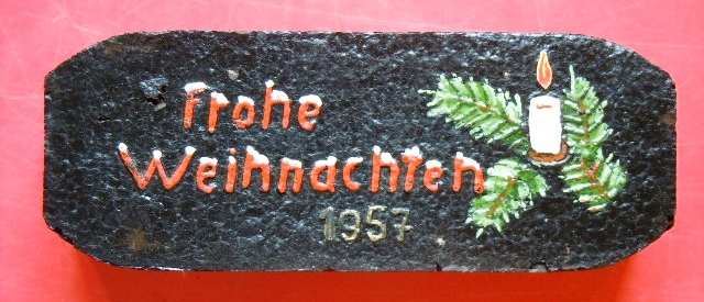 Dieses vorgestellte Schmuckbrikett erhielten verdiente Bergmänner des Braunkohlenwerkes Borna als Weihnachtsgeschenk im Dezember 1957.