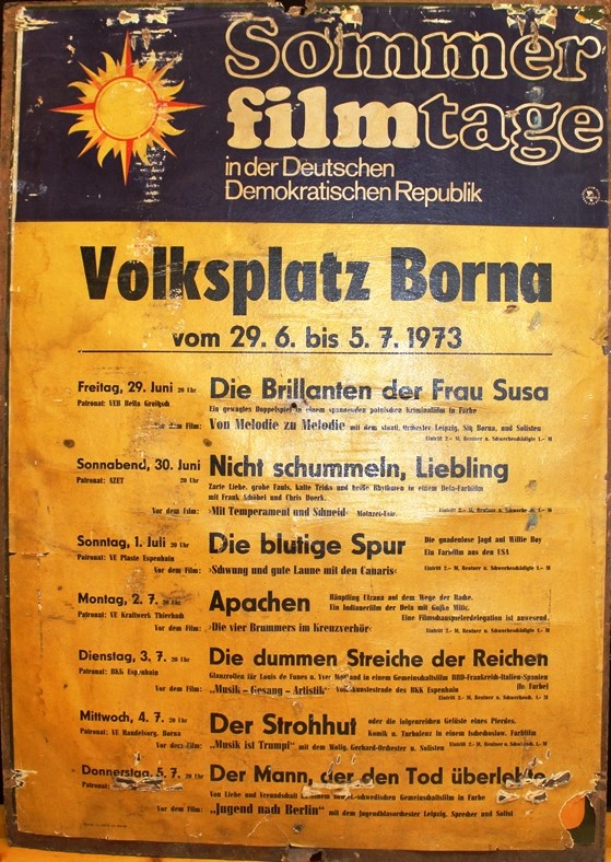 Unser Objekt des Monats ist ein Ankündigungsplakat der Sommerfilmtage vom 29. Juni bis 5. Juli 1973 auf dem Volksplatz Borna. Präsentiert wurde zum Beispiel der DDR-Musikfilm „Nicht schummeln, Liebling“ mit Frank Schöbel und Chris Doerk sowie der französische Spielfilm „Die dummen Streiche der Reichen“ mit Louis de Funes in der Hauptrolle. Jede Film- und Kulturveranstaltung der Sommerfilmtage unterstand einer Patenschaft einheimischer Betriebe, dies waren z.B. 1972 der VEB HO Borna, der VEB Plasta Espenhain und der VEB Bella Groitzsch.