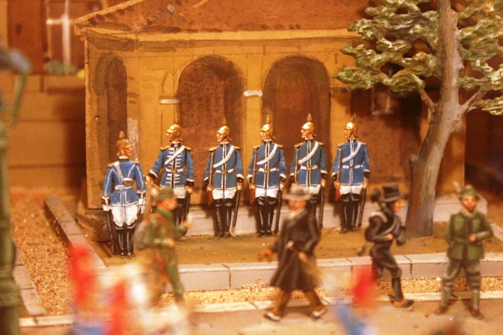 Sämtliche 41 Reiter, 6 Mann der Wache und 66 Zivilisten wurden von Erich Riedel originalgetreu bemalt und die Gebäude nach Unterlagen von 1901 gefertigt.