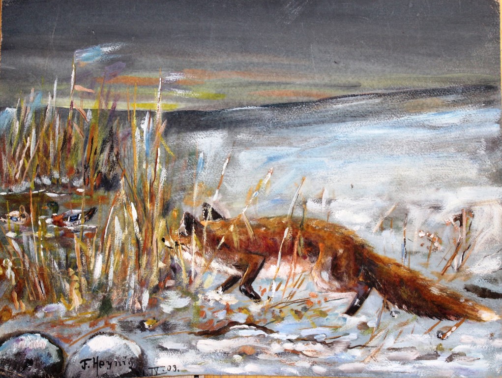 Diese detailreiche Zeichnung eines Fuchses auf der Entenjagd von Felix Heynig entstand als Arbeitsstudie während seines Studiums an der Kgl. Graphischen Akademie in Leipzig. Felix Heynig wurde am 11. Februar 1888 in Borna geboren. Er verlebte hier seine ersten Kindheits- und Schuljahre. Von 1903 bis 1906 absolvierte er ein Studium am der Kgl. Graphischen Akademie in Leipzig, heute die Hochschule für Grafik und Buchkunst.