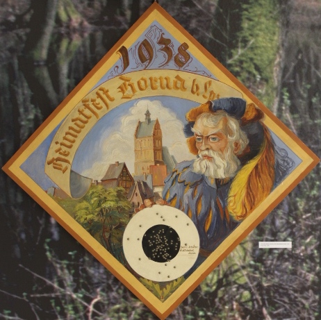 Anlässlich des Heimatsfests 1938 fand ein Schießwettbewerb in Borna statt. Um den Sieger zu ehren wurde eine Schützenscheibe angefertigt. Dargestellt ist die Stadtkirche im Hintergrund, rechts daneben im Bildmittelgrund, eine Figur in einer Fantasieuniform im Landsknecht-Stil.