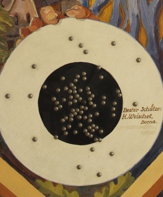 Angefertigt wurde die Schützenscheibe von dem Künstler Robert Kluge und ist in der aktuellen Sonderausstellung „Robert Kluge – Beliebter Lehrer und begnadeter Künstler‘‘ anlässlich des 150-jährigen Jubiläums des Gymnasium Borna, vom 26.04. – 20.08.2023, zu sehen.