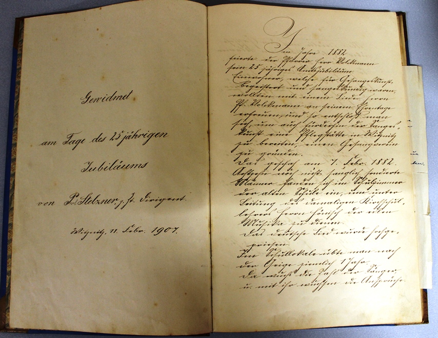 Diese handschriftliche Chronik wurde anlässlich des 25-jährigen Bestehens des Gesangvereins Witznitz 1907 vom Dirigenten Paul Stelzner angelegt. Diese wurde dann von den jeweiligen Vorsitzenden oder Dirigenten bis 1933 fortgeführt. Sie enthält ein Foto von Mitglieder beim Ausflug in die Sächsische Schweiz. Des Weiteren sind am Ende verschiedene Programmzettel und Tafellieder von Veranstaltungen des Vereins eingebunden.