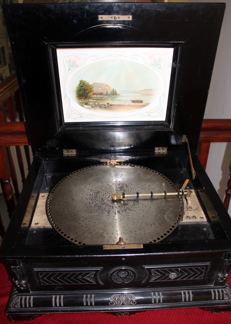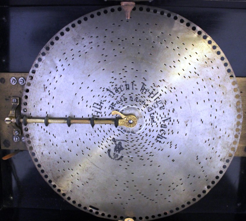 Um die Lochplatte zu spielen, musste mit einer Kurbel ein Federwerk aufgezogen werden. Die Melodien waren auf Lochplatten aufgebracht, die leicht ausgetauscht werden konnten. Zu diesem Lochplatten-Musikautomat gehören noch 15 Lochplatten mit Marsch- und Weihnachtsmusik sowie bekannten Volksliedern.