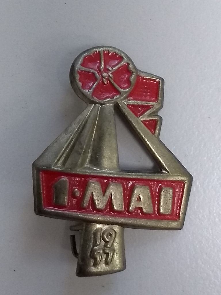 Mit diesem knapp 4 cm großen Maibaum schmückte man sich 1957, wenn man Fähnchen schwenkend an der Demonstration zum internationalen Arbeiter-Kampftag teilgenommen hat. Im Juli 1889 gab es in Paris einen internationalen Arbeiterkongress. Auf diesem wurde beschlossen, alljährlich am 1. Mai weltweit Kundgebungen zu veranstalten, um für eine wirksame Arbeiterschutzgesetzgebung zu kämpfen. Schon 1890 verband man am Maifeiertag die Kundgebung mit einem Ruhen der Arbeit, um die Macht der Arbeiter zu zeigen.