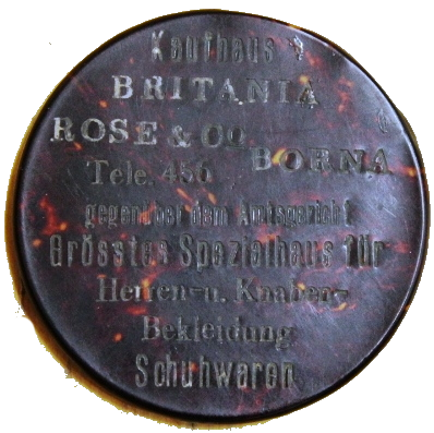 Diesen Handspiegel vergaben um 1925 die Mitarbeiter des Kaufhauses „Britania“ an ihre Kunden als kleines Werbegeschenk. Beschriftet ist dieser mit folgender Information: „Kaufhaus BRITANIA ROSE & Co. BORNA Tel. 456 gegenüber dem Amtsgericht Grösstes Spezialhaus für Herren- u. Knaben-Bekleidung Schuhwaren“.