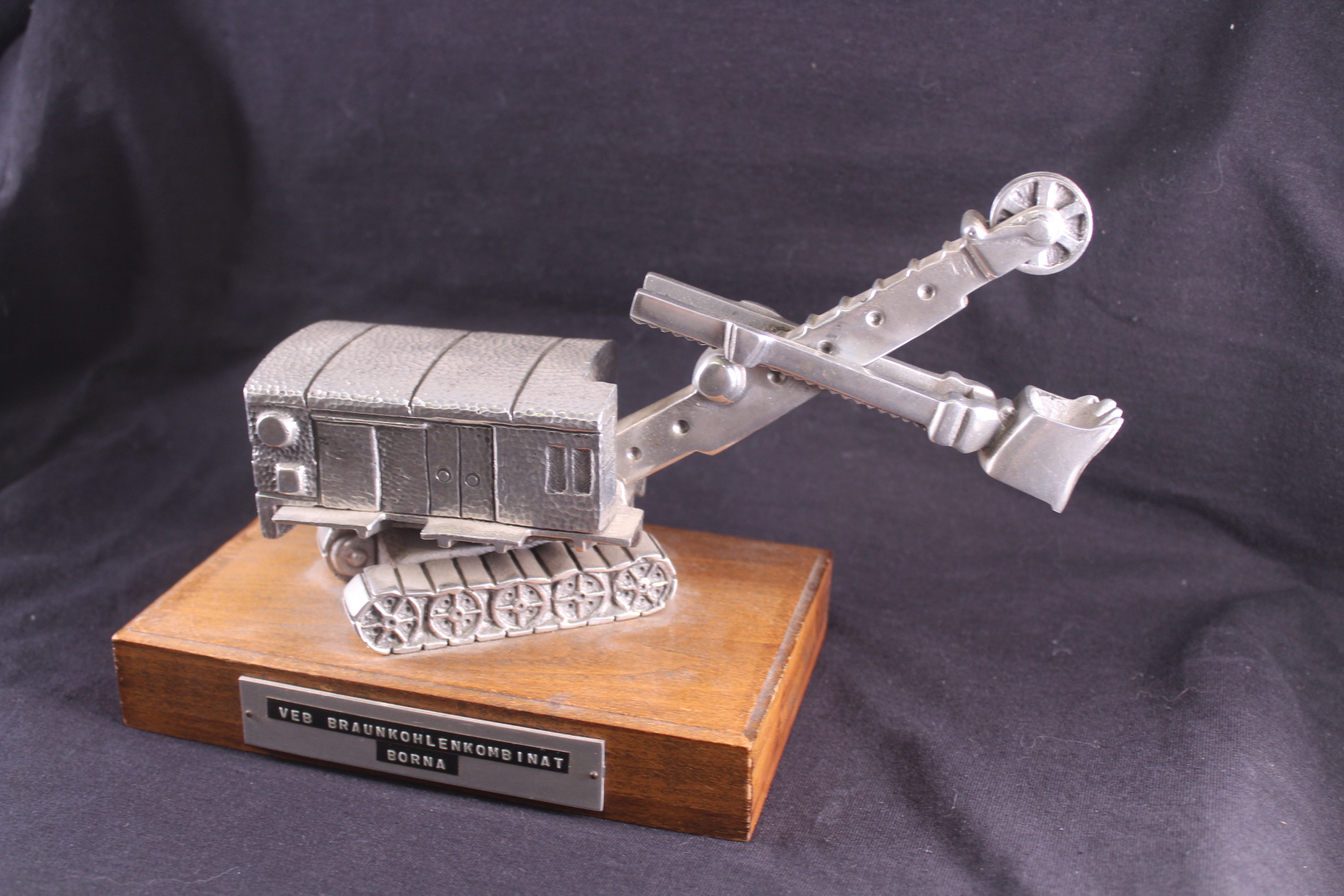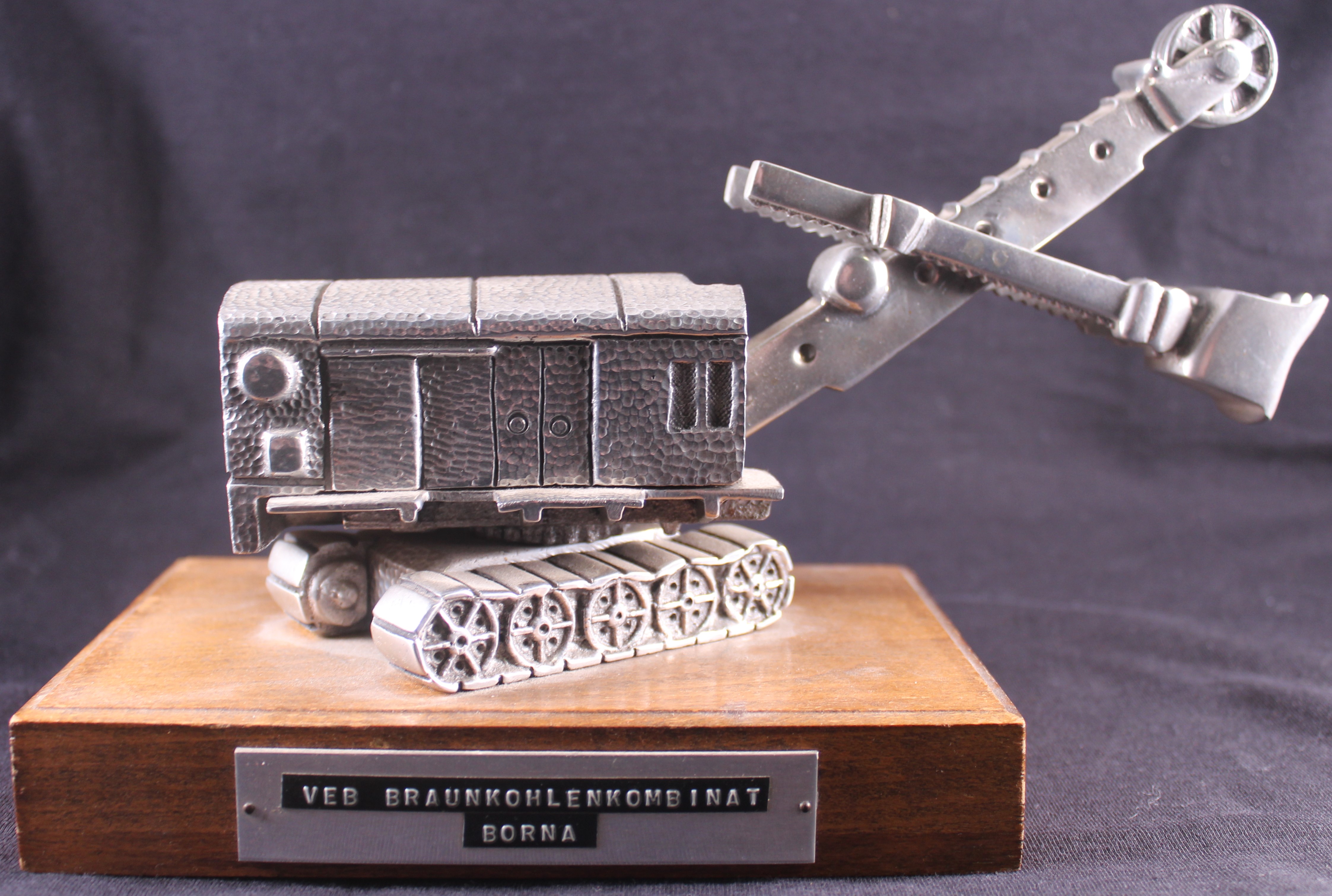 Durch eine Schraube ist alles auf einem Holzsockel mit Plakette (Aufschrift: VEB Braunkohlenkombinat Borna) montiert.