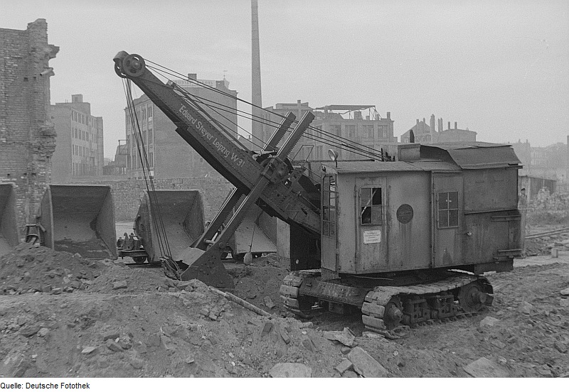 Bild rechts Quelle: Deutsche Fotothek - Seilbagger mit Hochlöffel auf einer Baustelle 1953