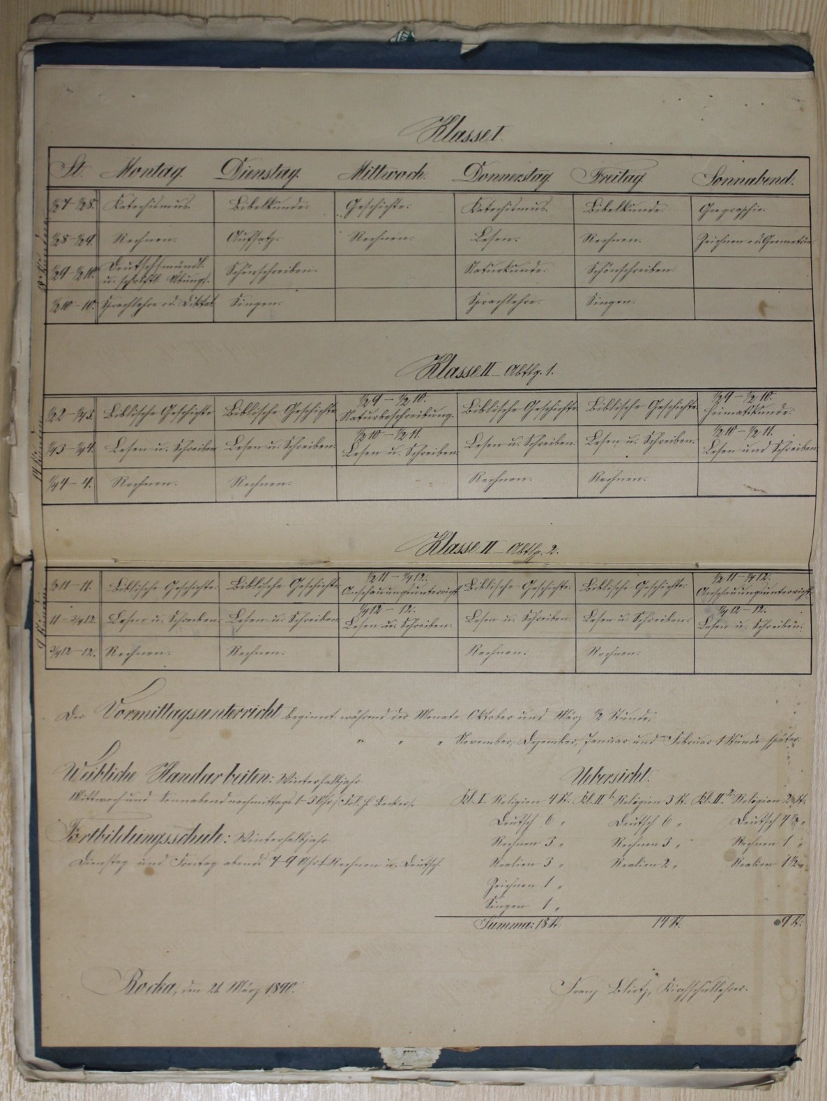 Ebenfalls sehr aufschlussreich sind die verschiedenen Unterrichts- und „Lectionspläne“. Sie zeigen im Vergleich zu heutigen Stundenplänen einen eher entspannt gefüllten Tagesablauf, wie man dem „Lectionsplan des Schuljahres 1890/91“, erstellt vom Kirchenschullehrer Franz Blietz entnehmen kann.